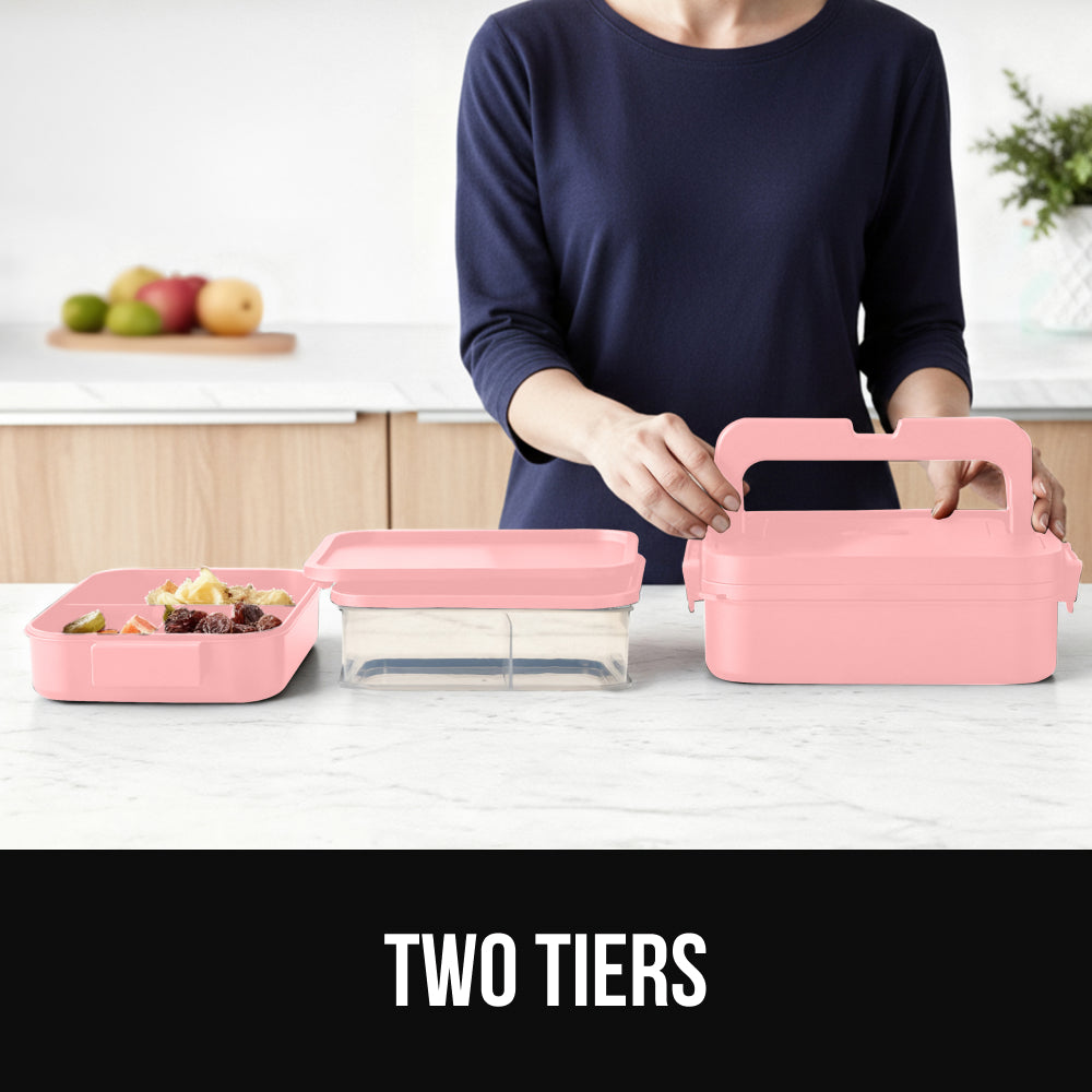 10 CUP BENTO BOX: this bento lunch box holds 10 cups and features 2 tiers to pack multiple meals; top tier compartments fit a sandwich made with most standard size bread and two smaller compartments that are generously sized for side salads, fruit, snacks or even a sweet treat; second tier provides space for a second hot or cold meal