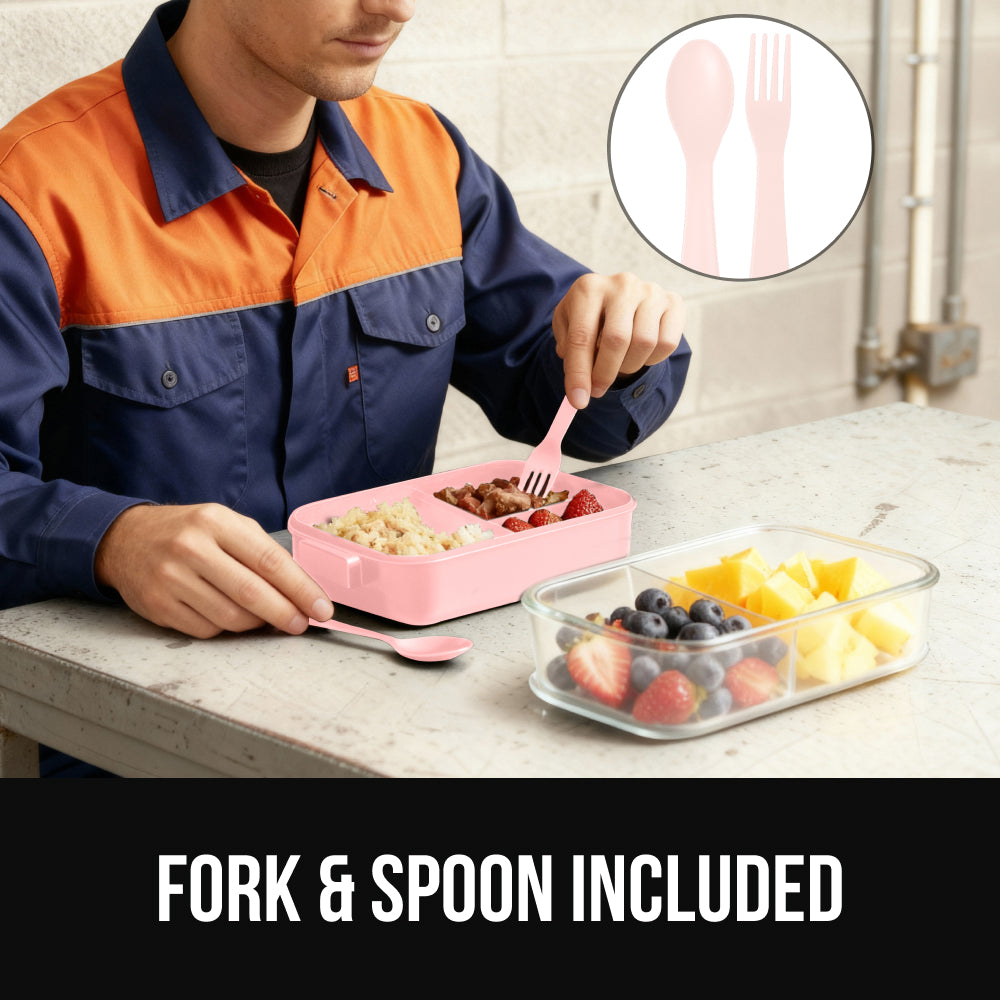 EASY CARRY LID INCLUDES SPOON AND FORK: bento lunch box comes with a fork and spoon that conveniently fit into the dedicated space in the lid so you always have utensils on hand; ergonomic handle on the top lid is comfortable to carry; bento box measures 8.7 inches by 6.5 inches