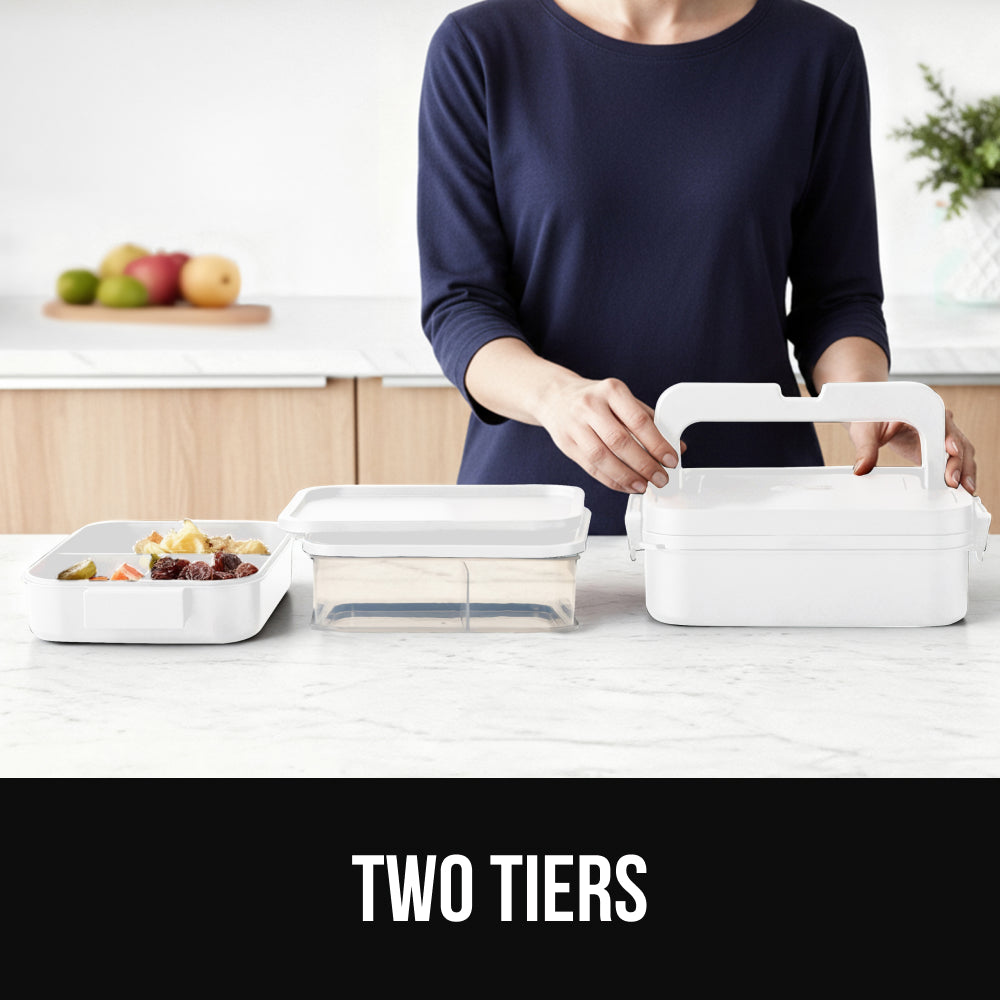 MODULAR DESIGN FOR HOT AND COLD FOOD: choose the size that fits your appetite; 5 cup bento lunch box is divided into 3 compartments; spacious 10 cup bento lunch box features an additional tier and is designed to help keep hot and cold meals separate to fuel your day; top tier has 2 compartments