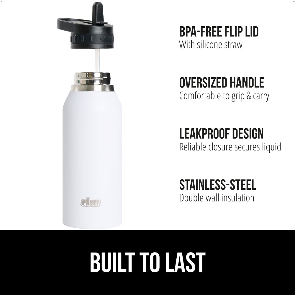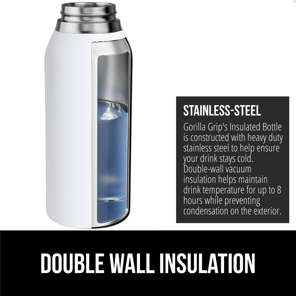KEEPS DRINKS COLD FOR 8 HOURS: the Gorilla Grip bottle is constructed from heavy duty stainless steel and features double wall vacuum insulation to help keep drinks cold for up to 8 hours