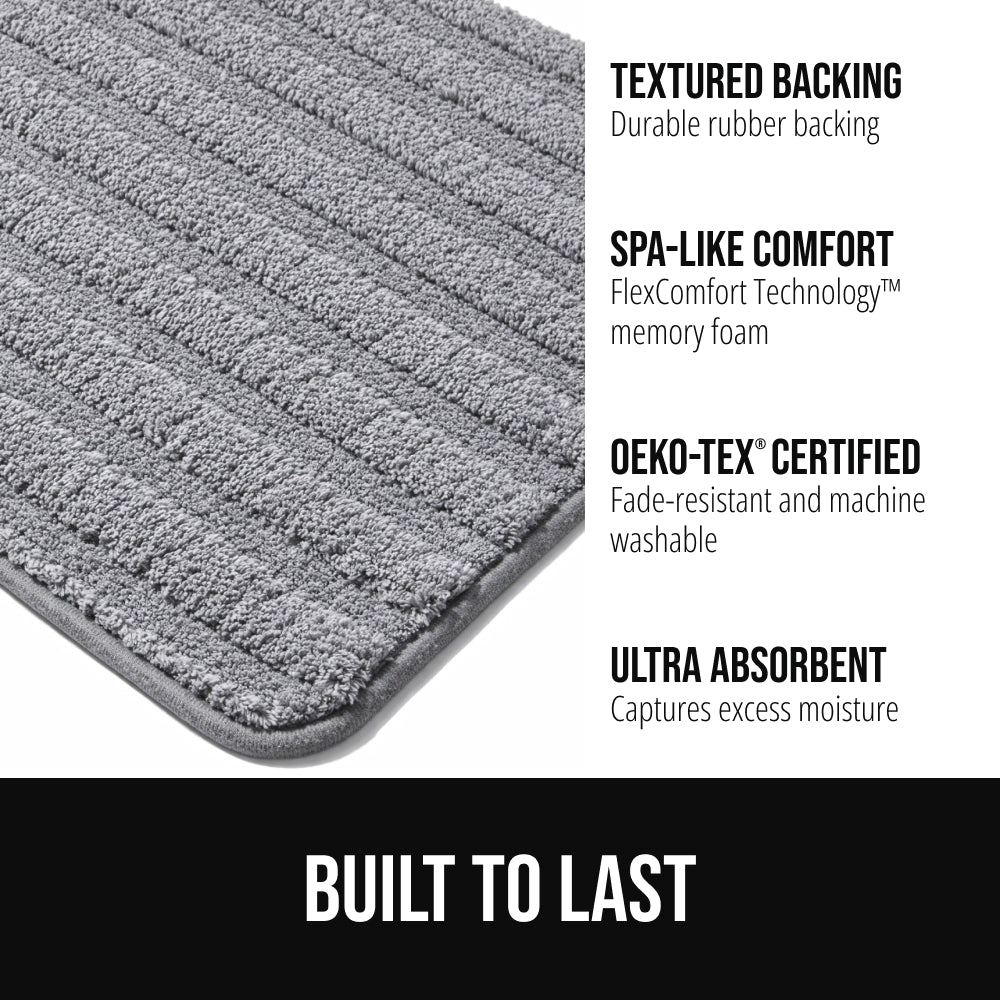 THICK MEMORY FOAM AND SOFT MICROFIBER TOP: high density memory foam provides a thick, supportive base; striped pattern fits in seamlessly into any bathroom décor