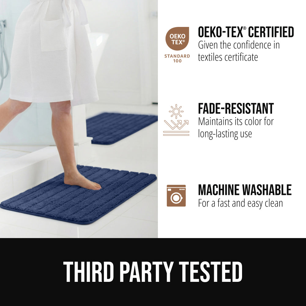 THIRD PARTY TESTED AND OEKO TEX CERTIFIED: bathroom rugs are OEKO TEX certified and third party tested for quality; the bathroom rug is fade-resistant for long-lasting use; machine washable design makes for easy and quick cleaning of bathroom rugs
