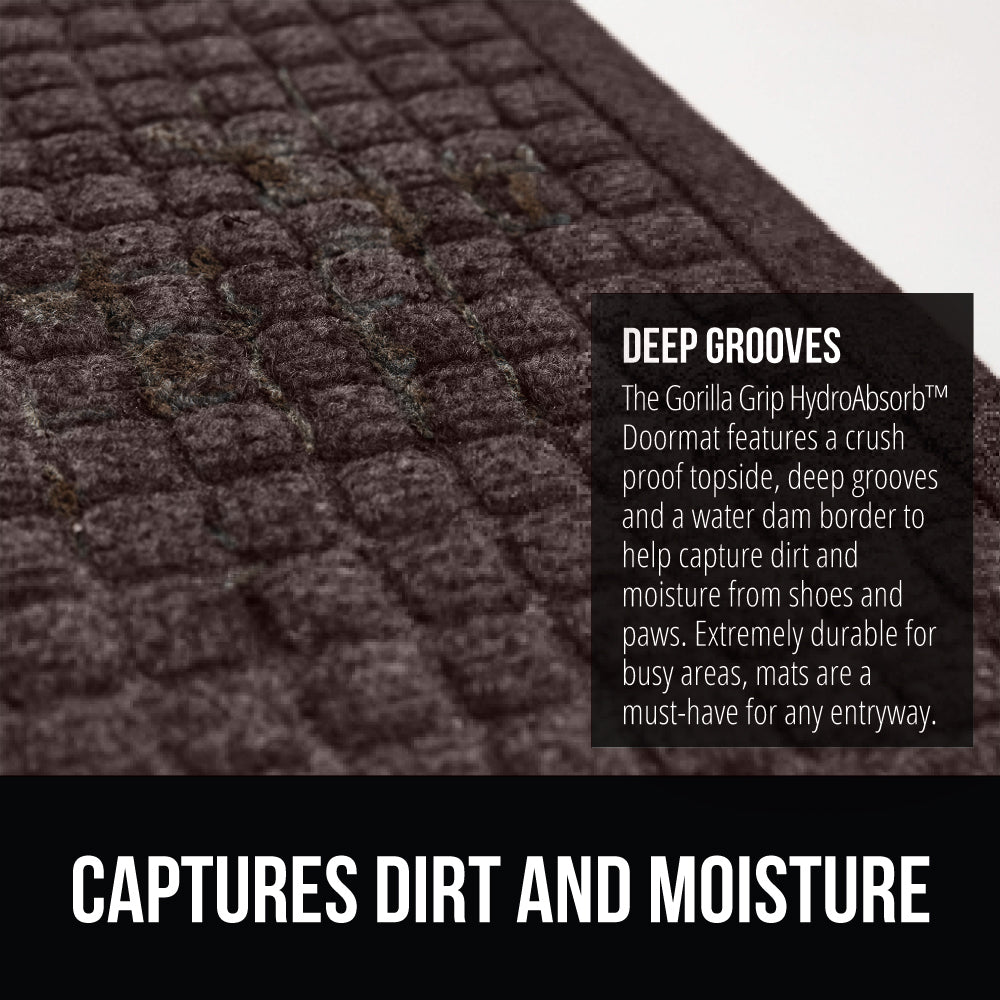 ULTRA ABSORBENT HYDROABSORB DOORMAT: Our most absorbent doormat, the Gorilla Grip HydroAbsorb mat can absorb up to 1.7 cups of water; featuring an innovative water dam border with deep grooves and bi level design to help capture water and prevent excess moisture from spilling onto your floor; ultra soft, polyester topside absorbs more water than other materials