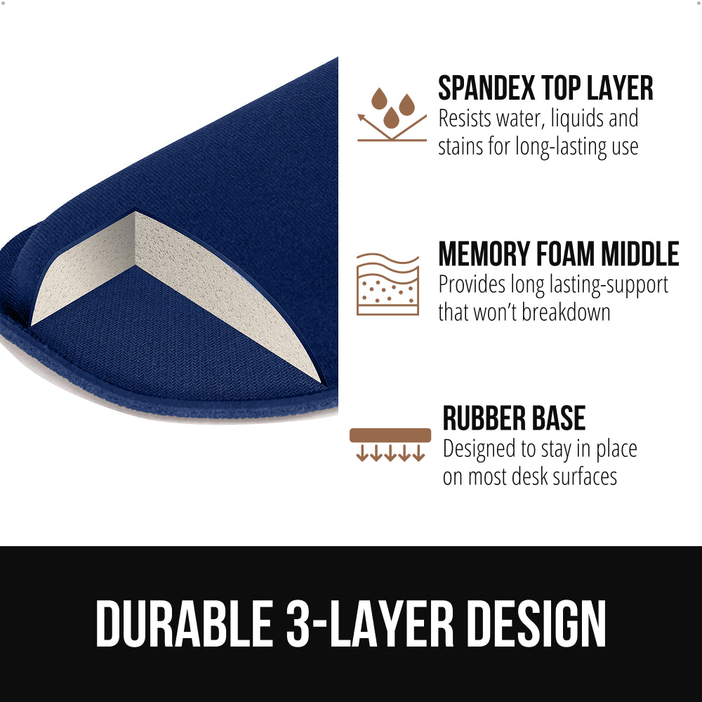 SUPERIOR CONSTRUCTION: featuring a 3 layer design, the rests are designed for long lasting use; durable rubber bottom stays in place on most surfaces; thick inner memory foam material for extra support; soft top spandex layer for additional comfort; wrist rest measures 17 by 3.5 inches, making it a perfect fit for most desks; mouse pad rest measures 6 by 3.3 inches